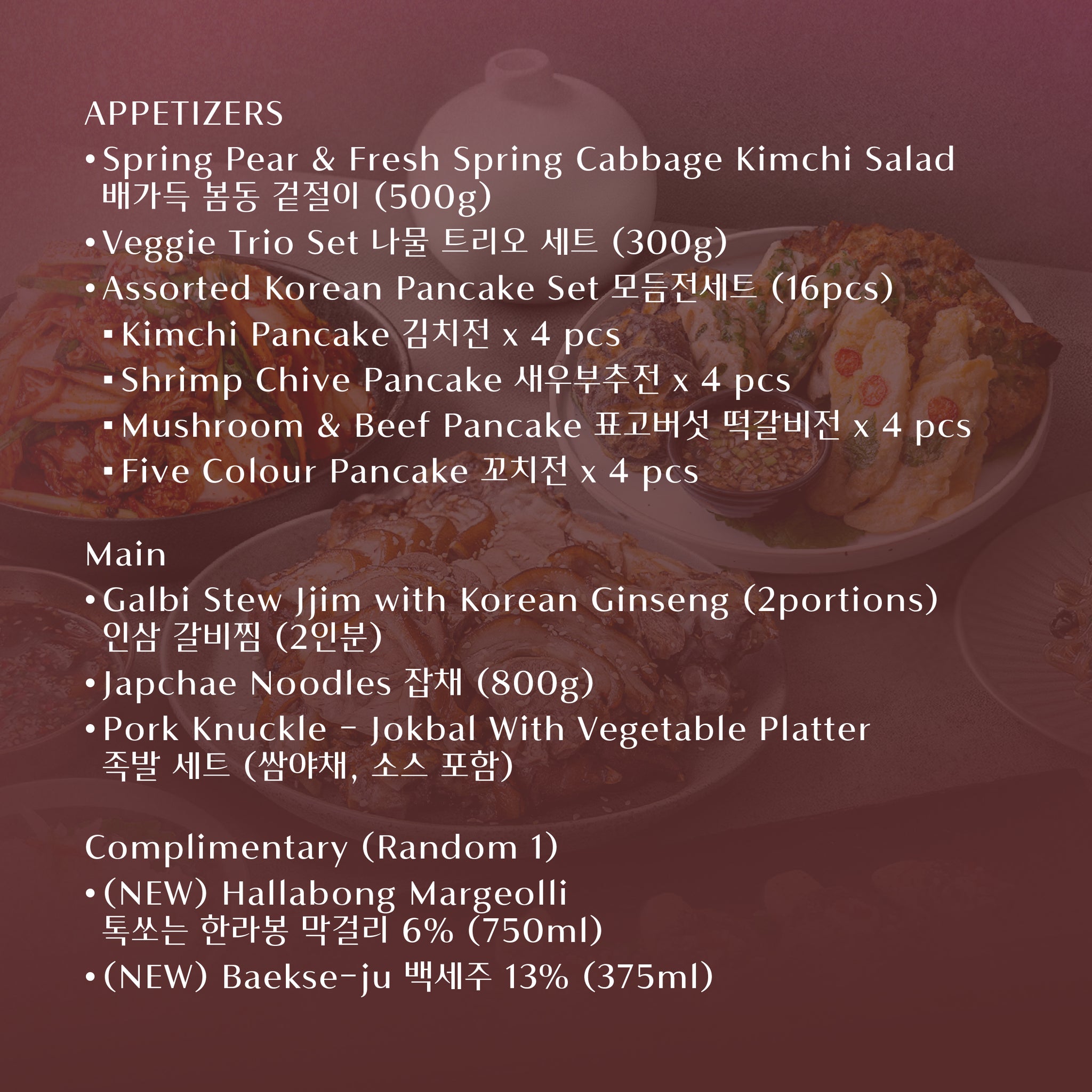 Indulge in our tender Ginseng Galbi Stew, a variety of 4 freshly made Korean Pancakes, and the crisp, refreshing Pear & Spring Cabbage Kimchi Salad. The feast continues with our hearty Jokbal (Pork Knuckle) Set, classic Japchae, and a healthy and refresh Veggie Trio to complete your table. For the perfect holiday touch, pair your meal with a glass of Hallabong Makgeolli or Baekse-ju!